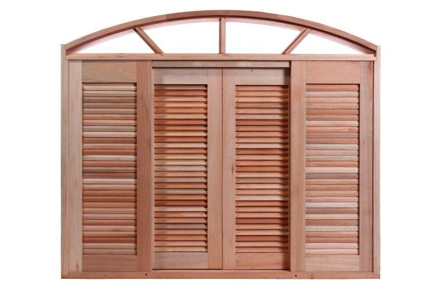 Veneziana de correr 6 folhas, sendo 2 folhas de veneziana fixa nas laterais, 2 folhas de veneziana móveis com fechamento para o centro e 2 folhas quadriculadas para vidro móveis com fechamento para o centro, de madeira montado em batente com espessura de 14 cm em detalhe arco no padrão cedro.